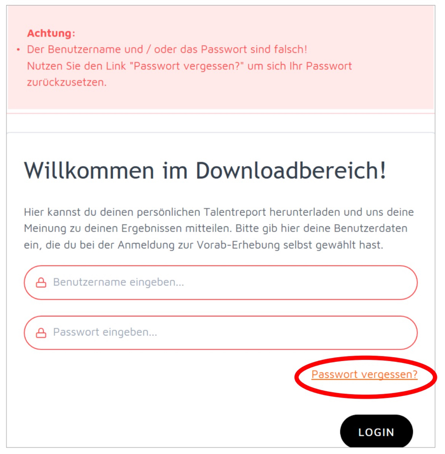 5. Mit Klick auf den Link „Passwort vergessen“, kann man ein neues Passwort anfordern.